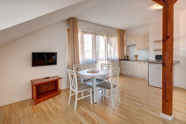 Przestronna, w pełni wyposażona kuchnia dostępna dla wszystkich gości. Utrzymana w ciepłych, drewnianych tonach, tworzy przytulną atmosferę sprzyjającą wspólnemu gotowaniu i spędzaniu czasu.